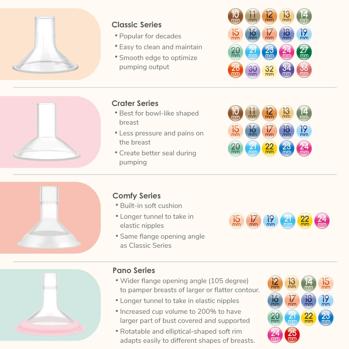 Upgrade your breast pumping experience with Maymom MyFit Crater Series 22 mm Breastshields. These two-piece small breastshields are compatible with Medela Breast Pumps, offering a long nipple tunnel for elastic nipples.