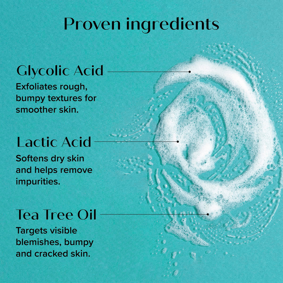 - SMOOTHING CLEANSE: Our glycolic acid body wash exfoliates and resurfaces rough and bumpy texture to reveal softer, smoother skin. The Alpha Hydroxy Acids within this exfoliating body wash prepares your skin for treatment body creams/lotions to effectively be applied by helping to remove the dry, dull skin that builds up on the surface of our skin. Dry skin can act like a shield that prevents active ingredients from penetrating.