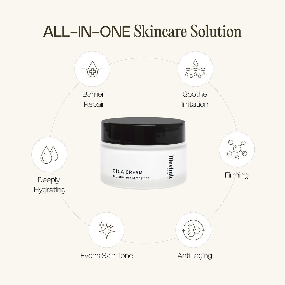 Meebak Cica Cream is a daily repair moisturizer enriched with Niacinamide, Ceramide, and Retinol. It provides deep hydration and soothing effects while locking in moisture, making it suitable for sensitive skin.