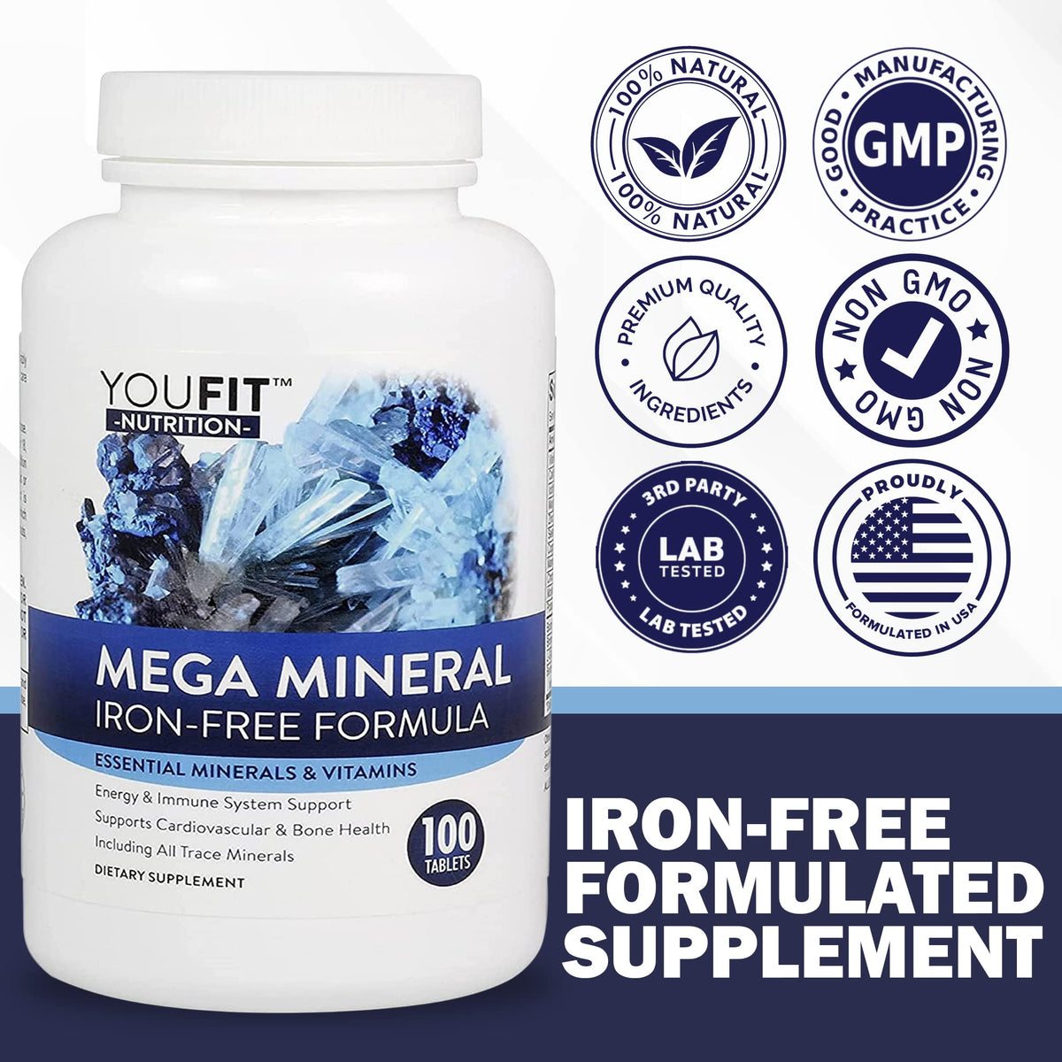 Mega Minerals Supplement by Youfit Nutrition | All 72 Trace Minerals | Premium Formula with Source of Minerals and Immune Health Support | Iron Free | All in One |1000mg Calcium 500mg Magnesium