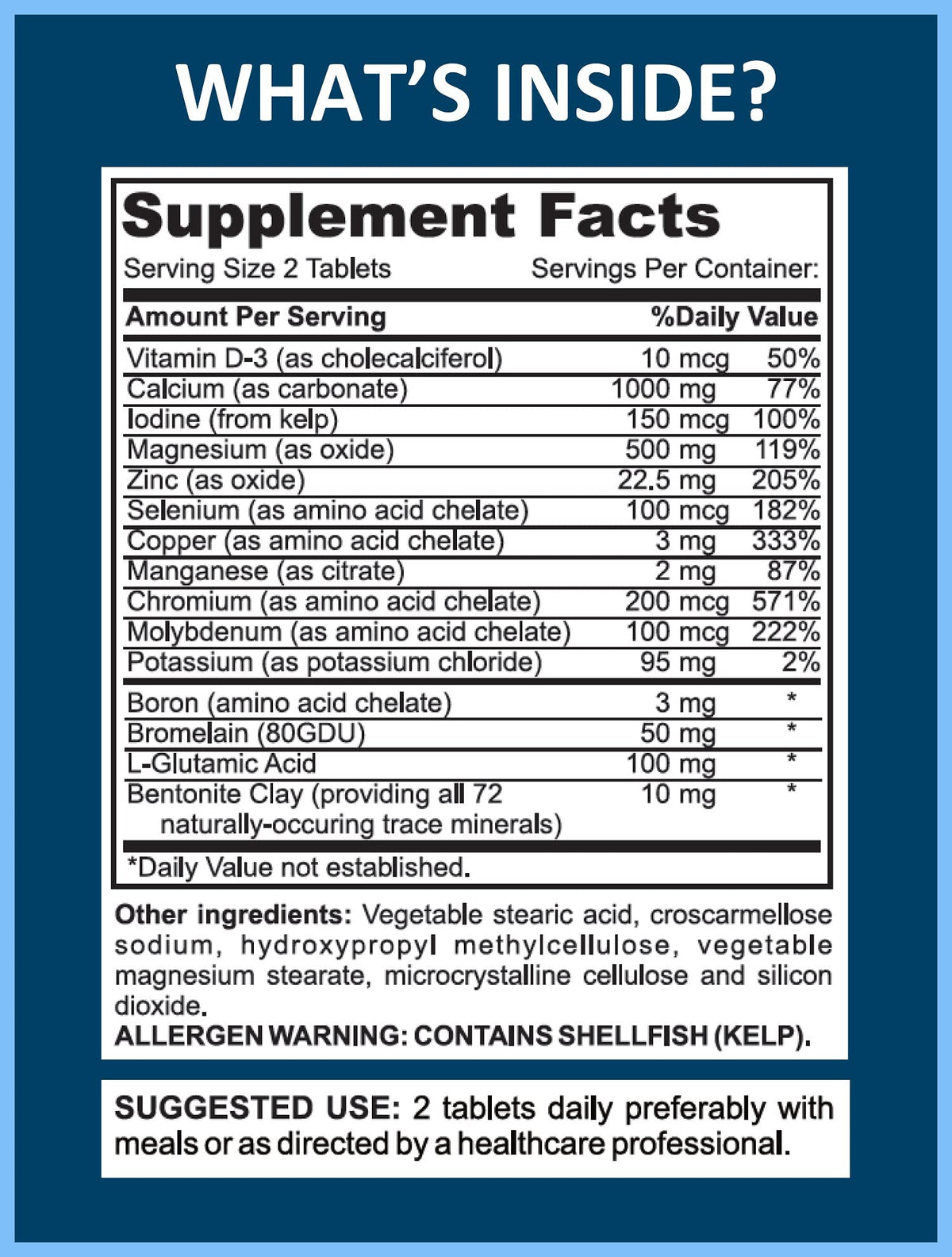Ingredients :: Vitamin D-3 (as cholecalciferol) Calcium (as carbonate) Iodine (from kelp) Magnesium (as oxide) Zinc (as oxide) Selenium (as amino acid chelate) Copper (as amino acid chelate) Manganese (as citrate) Chromium (as amino acid chelate) Molybdenum (as amino acid chelate) Potassium (as potassium chloride) Boron (as amino acid chelate) Bromelain (80GDU) Bromelain (80GDU) L-Glutamic Acid Bentonite Clay (providing all 72 Naturally-occurring trace minerals) Other ingredients: Vegetable stearic acid, croscarmellose sodium, hydroxypropyl methylcellulose, vegetable magnesium stearate, microcrystalline cellulose and silicon dioxide.