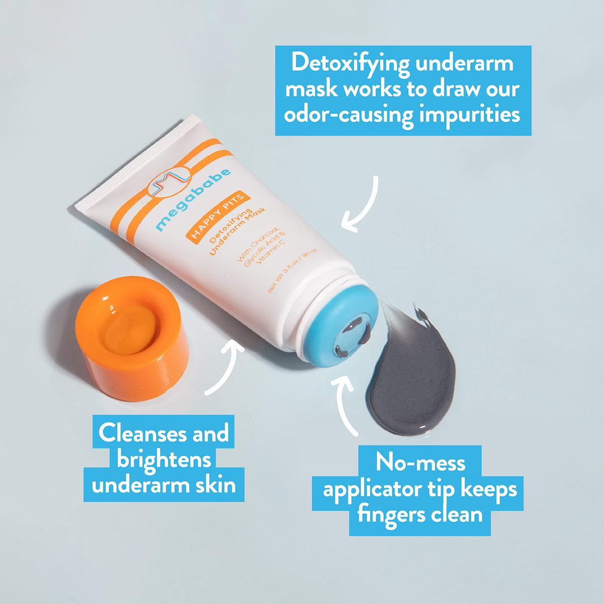 Revitalize your underarms with Megababe Underarm Mask - Happy Pits. Infused with detoxifying charcoal and Vitamin C, this 3 fl oz mask purifies and brightens the underarm area for a fresh and clean feel.