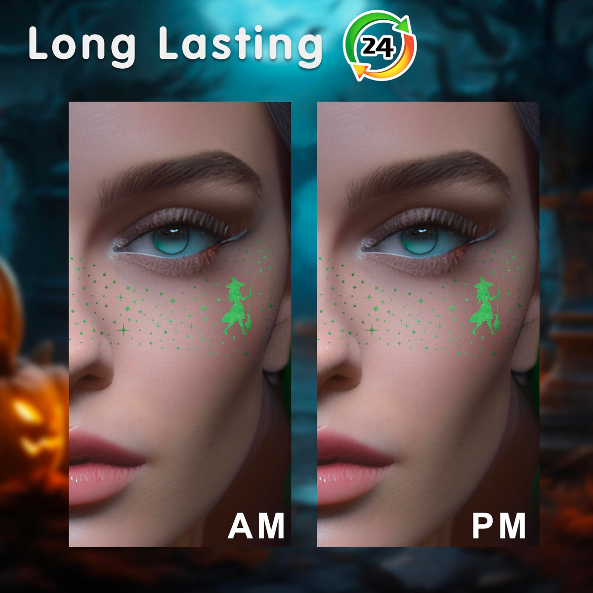 MEICOLY Halloween Glitter Freckles Witch Tattoos for Kids,Friendship Green Witch Pink Princess Stickers for Wicked Makeup Costume,Wicked Birthday Party Accessories,Wicked Party Favors,8 Counts