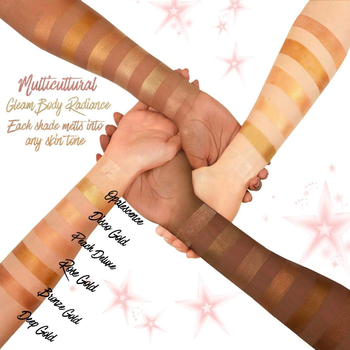 Melanie Mills Hollywood Gleam Body Radiance is a versatile makeup, moisturizer, and glow enhancer in one. With a radiant rose gold shade, this product adds a luminous finish to your face and body for a glamorous look.