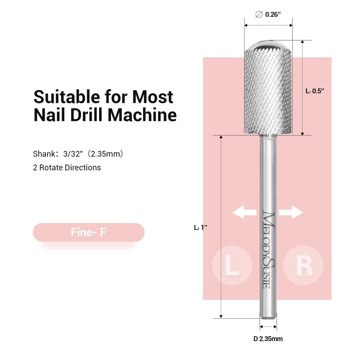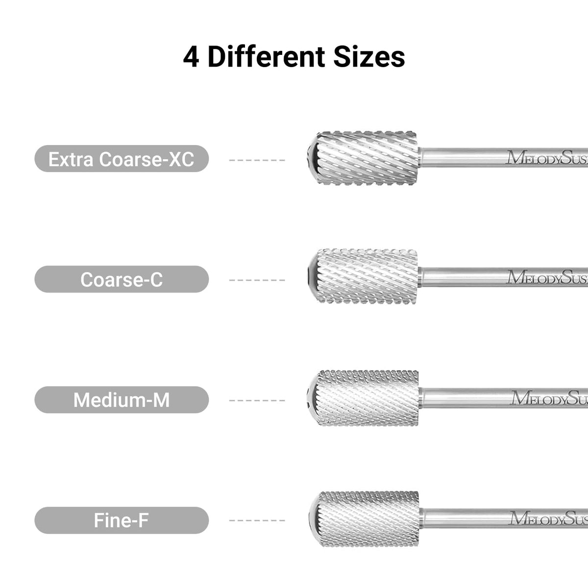 MelodySusie Safety Nail Drill Bits feature 3/32'' smooth round top large barrel carbide bits suitable for manicure, pedicure, cuticle gel polishing, and more. This silver series Bit-S set offers fine precision for nail care.