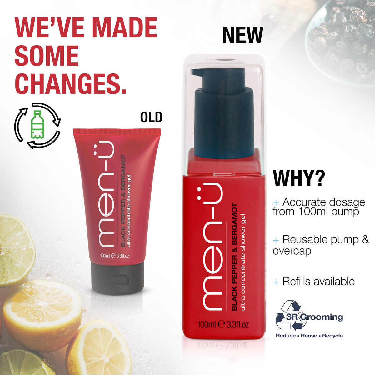 Invigorate your senses with men-ü Black Pepper & Bergamot Ultra Concentrate Shower Gel. This 3.3 fl oz shower gel delivers a refreshing and energizing experience, leaving your skin cleansed and revitalized.
