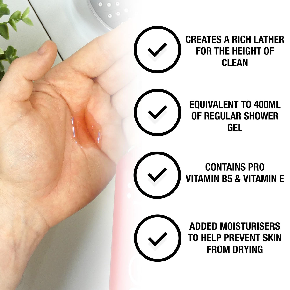 Squeeze a small amount into wet palms small thumbnail size and generate lather between palms in the shower. Apply over the body, keeping out of eyes. Repeat over the remainder of the body. Rinse thoroughly.