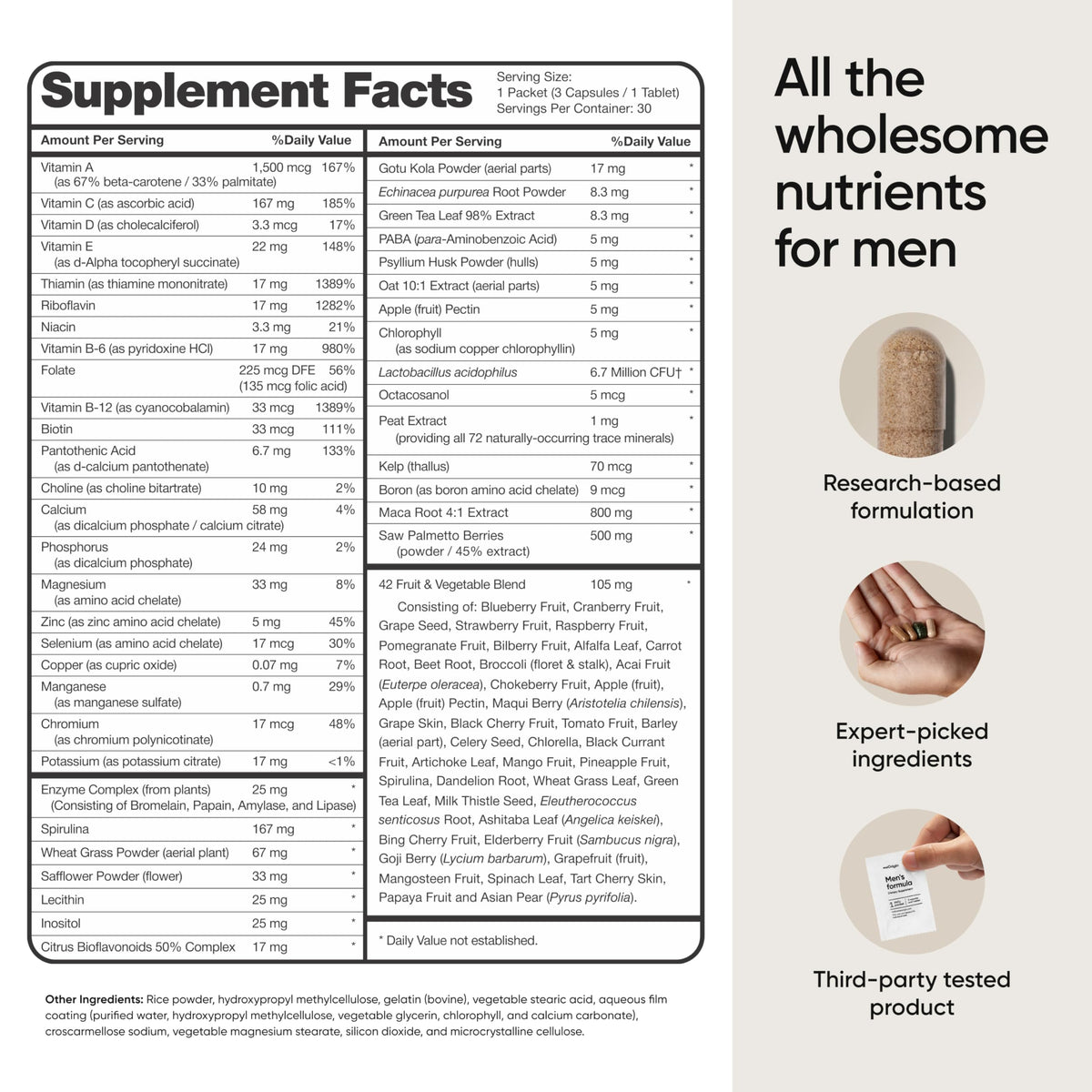 Ingredients: Vitamin A, Vitamin C, Vitamin D, Vitamin E, Thiamin, Riboflavin, Niacin, Vitamin B6, Folate, Vitamin B12, Biotin, Pantothenic Acid, Calcium, Phosphorus, Magnesium, Zinc, Selenium, Copper, Manganese, Chromium, Potassium, Boron, Citrus Bioflavonoids 50 Complex, PABA, Inositol, Lecithin, Apple Pectin, Enzyme Complex, Chlorophyll, Octacosanol, Choline, Kelp, Green Tea Leaf, Oat, Peat Extract, Saw Palmetto Berries, Maca Root, Lactobacillus acidophilus, Spirulina, Wheat Grass Powder, Safflower Powder, Gotu Kola Powder, Echinacea purpurea Root Powder, Psyllium Husk Powder, Blueberry Fruit, Cranberry Fruit, Grape Seed, Strawberry Fruit, Raspberry Fruit, Pomegranate Fruit, Bilberry Fruit, Alfalfa Leaf, Carrot Root, Beet Root, Broccoli, Acai Fruit, Chokeberry Fruit, Apple, Maqui Berry, Grape Skin, Black Cherry Fruit, Tomato Fruit, Barley, Celery Seed, Chlorella, Black Currant Fruit, Artichoke Leaf, Mango Fruit, Pineapple Fruit, Dandelion Root, Milk Thistle Seed, Eleutherococcus senticosus Root, Ashitaba Leaf, Bing Cherry Fruit, Elderberry Fruit, Goji Berry, Grapefruit, Mangosteen Fruit, Spinach Leaf, Tart Cherry Skin, Papaya Fruit, Asian Pear.