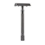The MERKUR 23B Double Edge Safety Razor features a black long knurled brass handle made in Germany, offering a classic shaving experience with a plastic-free three-piece design and a closed comb straight bar for a smooth and precise shave.