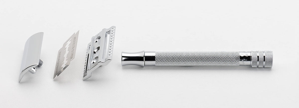 Short Product Description :: The top selling double-edge safety razor, with an elegant chrome finish and a long (4”) knurled handle for grip and control. Also known as the MERKUR 23C or 180, it is compatible with all double-edge blades.