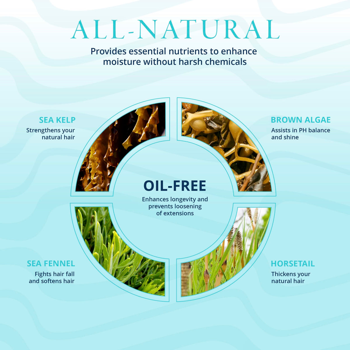 Ingredients: Deionized Water, Cetyl Alcohol, Glycerin, Stearalkonium Chloride, CaprylicCapric Trigyceride, Cyclopentasiloxane, Cetrimonium Bromide, Crithmum Maritimum Sea Fennel Extract, Pelvetia Canaliculata Brown Algae Extract, Laminaria Digitata Sea Kelp Extract, Equisetum Arvense Horsetail Extract, Panthenol, Hydrolyzed Rice Protein, Hydrolyzed Soy Protein, Cetrimonium Chloride, Trideceth12, Amodimethicone, Polyquaternium 37, Propylene Glycol DicaprylateDicaprate, Trideceth6, Citric Acid, Ethylhexylglycerin, Phenoxyethanol, Fragrance, Blue 1