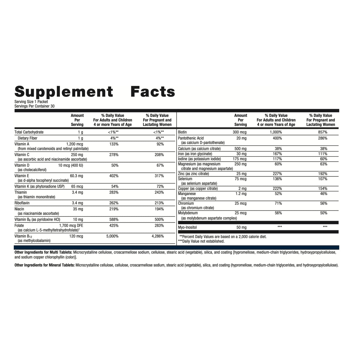 Ingredients :: Total Carbohydrate 1g, Dietary Fiber 1g, Vitamin A 1200mcg (from mixed carotenoids and retinyl palmitate), Vitamin C (as ascorbic acid and niacinamide ascorbate) 250mg, Vitamin D (as cholecalciferol) 10mcg (400 IU), Vitamin E (as d-alpha tocopheryl succinate) 60.3mg, Vitamin K (as phytonadione USP) 65mcg, Thiamin (as thiamin mononitrate) 3.4mg, Riboflavin 3.4mg, Niacin (as niacinamide ascorbate) 35mg, Vitamin Be (as pyridoxine HCI) 10mg, Folate 1700mcg DFE (as calcium L-5-methyltetrahydrofolate), Vitamin B12 (as methulenhalamin) 120mcg, Biotin 300mcg, Pantothenic Acid 20mg(as calcium D-pantothenate), Calcium(as calcium citrate) 500mg, Iron(as iron glycinate) 30mg, lodine(as potassium iodide) 175mcg, Magnesium(as magnesium) 250mg citrate and magnesium aspartate), Zinc(as zinc citrate) 25mg, Selenium(as selenium aspartate) 75mcg, Copper(as copper citrate) 2mg, Manganese (as manganese citrate) 1.2mg, Chromium(as chromium citrate) 25mcg, Molybdenum(as molvbdenum aspartate comolex) 25mcg,, Myo-Inositol 50mg Other Ingredients for Multi Tablets: Microcrystalline cellulose, croscarmellose sodium, cellulose, stearic acid (vegetable), silica, and coating hypromellose, medium-chain triglycerides, hydroxypropylcellulose, and sodium copper chlorophyllin (color). Other Ingredients for Mineral Tablets: Microcrystalline cellulose, cellulose, croscarmellose sodium, stearic acid (vegetable), silica, and coating (hypromellose, medium-chain triglycerides, and hydroxypropylcellulose).