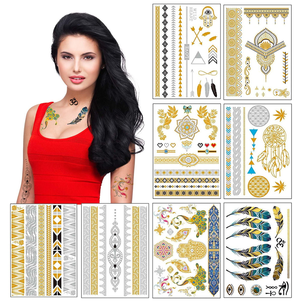 Metallic Temporary Tattoos for Girls Women Teens - 8 Sheets 100+ Gold Silver Temporary Tattoos Glitter Shimmer Tattoo Designs Jewelry Tattoos - Color Flash Fake Waterproof Tattoo Stickers (Mustique)