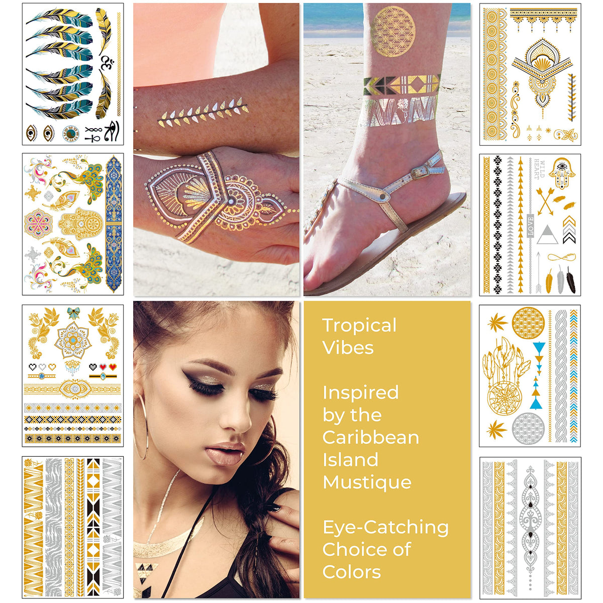 Metallic Temporary Tattoos for Girls Women Teens in Mustique offer a fun and stylish way to accessorize your look with shimmering designs. These temporary tattoos are easy to apply and perfect for adding a touch of glamour to any outfit.