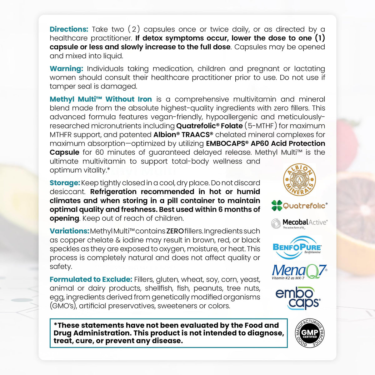 - : When supplementing, absorption is key! Methyl Multi without Iron is formulated with Quatrefolic Folate (5-MTHF), Albion TRAACS mineral chelates, and other micronutrients in their pre-methylated and coenzyme forms for optimal absorption and bioavailability, all together in patented EMBOCAPS AP60 acid resistant vegetable capsules designed for a guaranteed 60 minutes of acid-protection.
