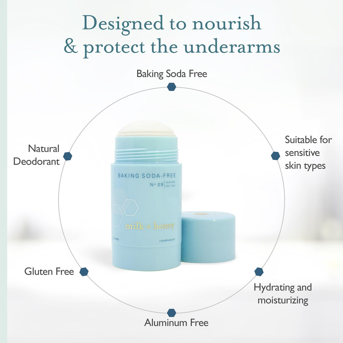 Stay fresh naturally with milk + honey Baking Soda Free Deodorant No. 09. This aluminum-free deodorant, infused with lavender and tea tree scent, provides long-lasting odor protection for both women and men without harsh chemicals.