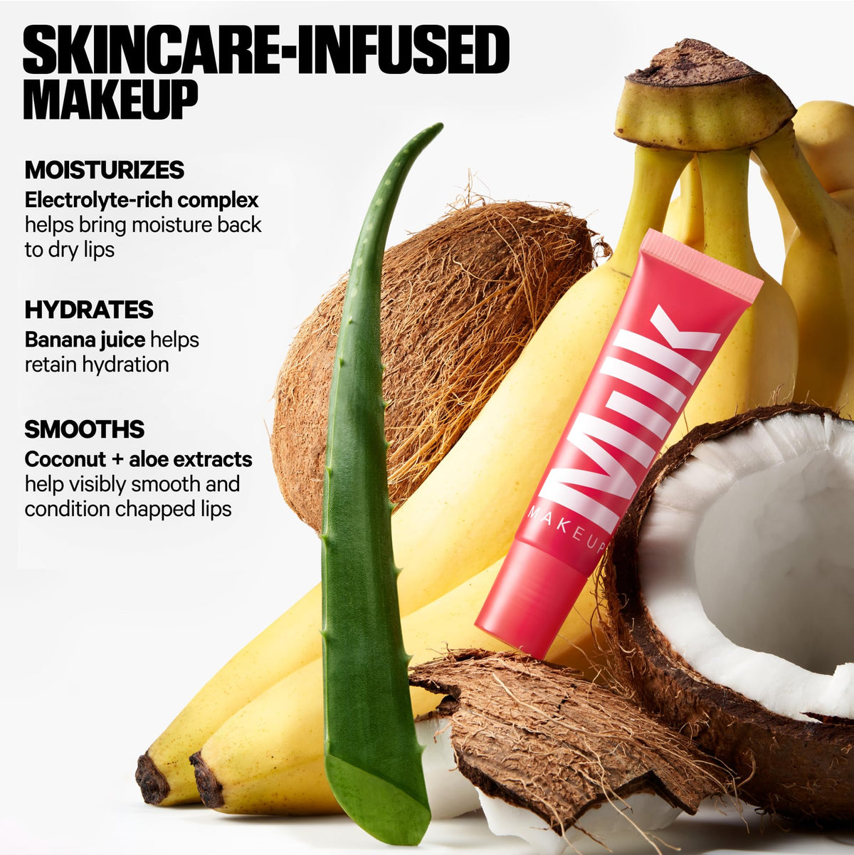 Skincare-Infused Makeup: Electrolyte Rich Complex of Zinc, Copper + Magnesium helps replenish moisture, Banana Juice helps retain hydration, while Coconut + Aloe Water Extracts help visibly smooth and condition chapped lips