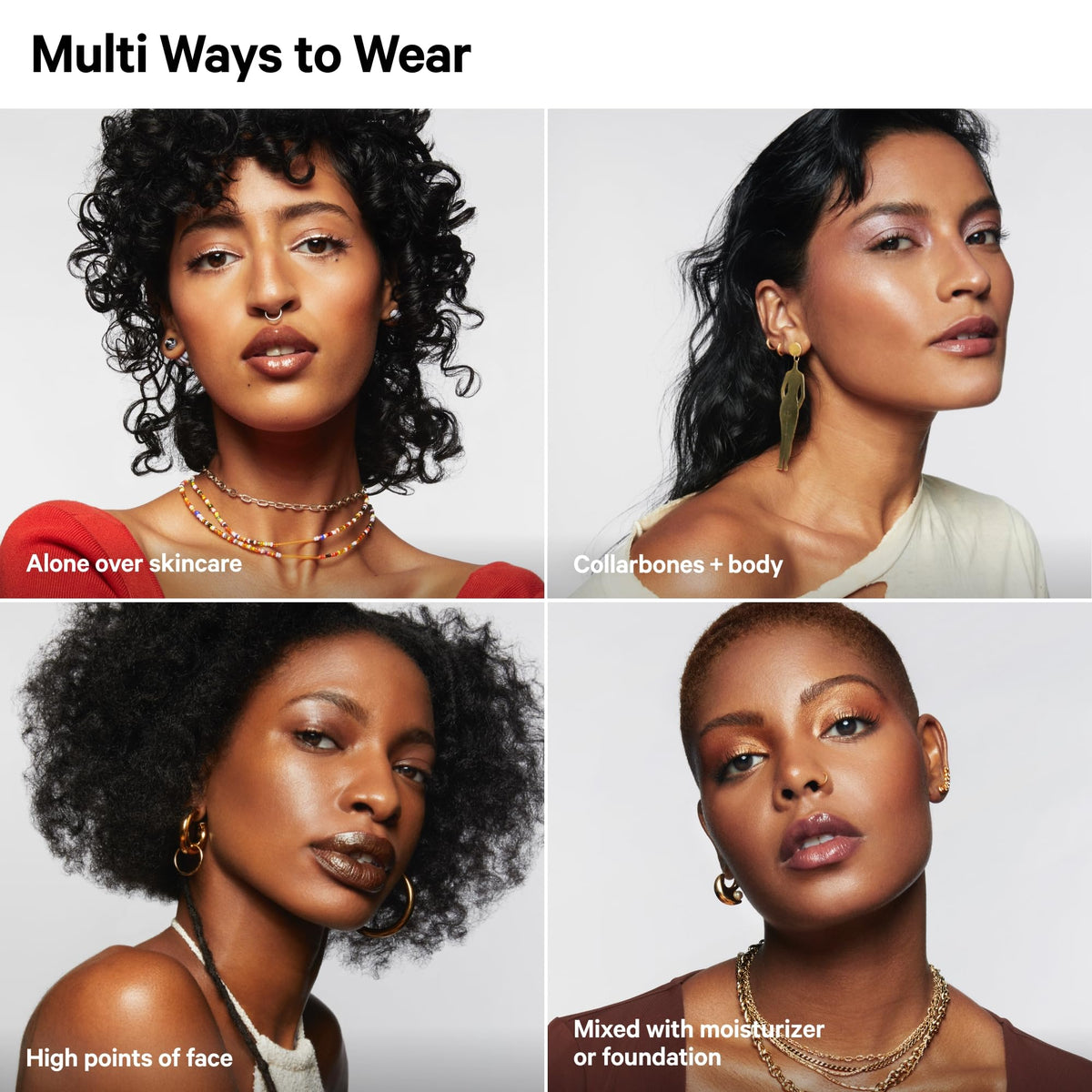 -To wear as a highlighter, gently squeeze tube to dispense a small dot of formula and apply to cheekbones, nose bridge, collarbones. -For illuminator, use dime-size, blend onto face and body. -Can be mixed with skincare or makeup.