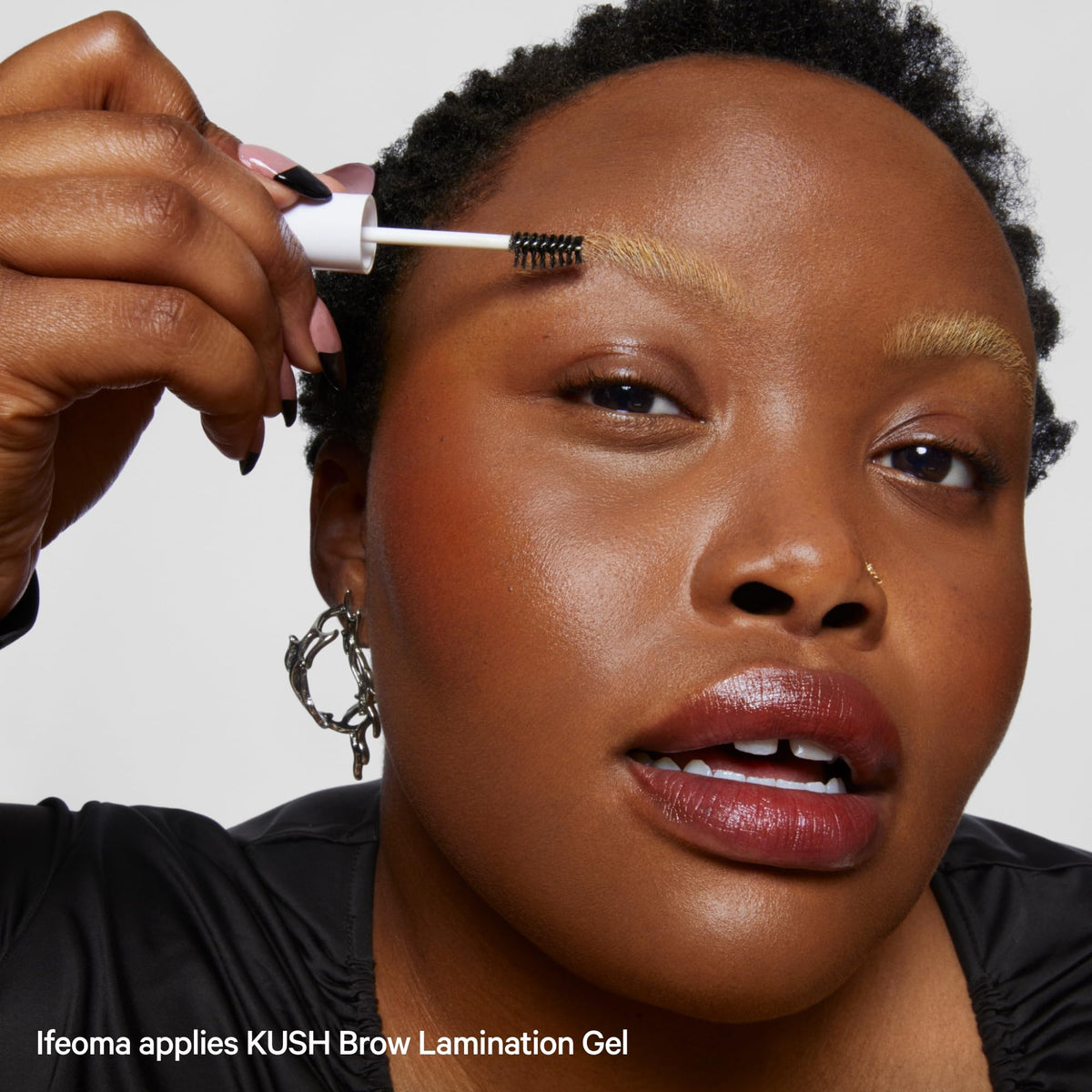 Apply the Milk Makeup KUSH Brow Lamination Gel using the Brow Lift Brush. Define and set your brows for a long-lasting laminated effect.
