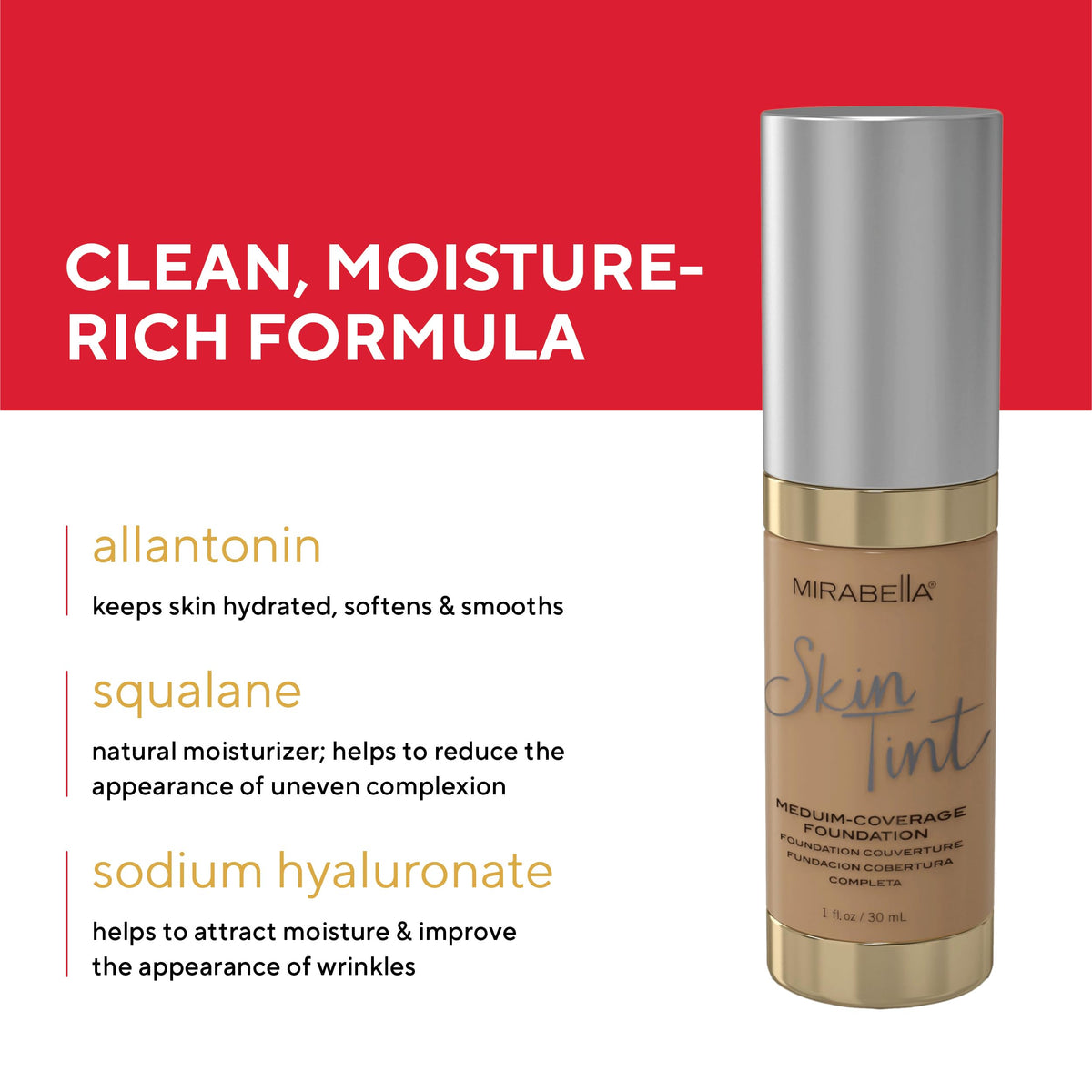 Experience flawless skin with Mirabella Skin Tint Creme Liquid Foundation Makeup. This oil-free mineral foundation provides medium coverage and is enriched with Hyaluronic Acid, Squalane, and Allantoin, suitable for all skin types, especially IC Cool.