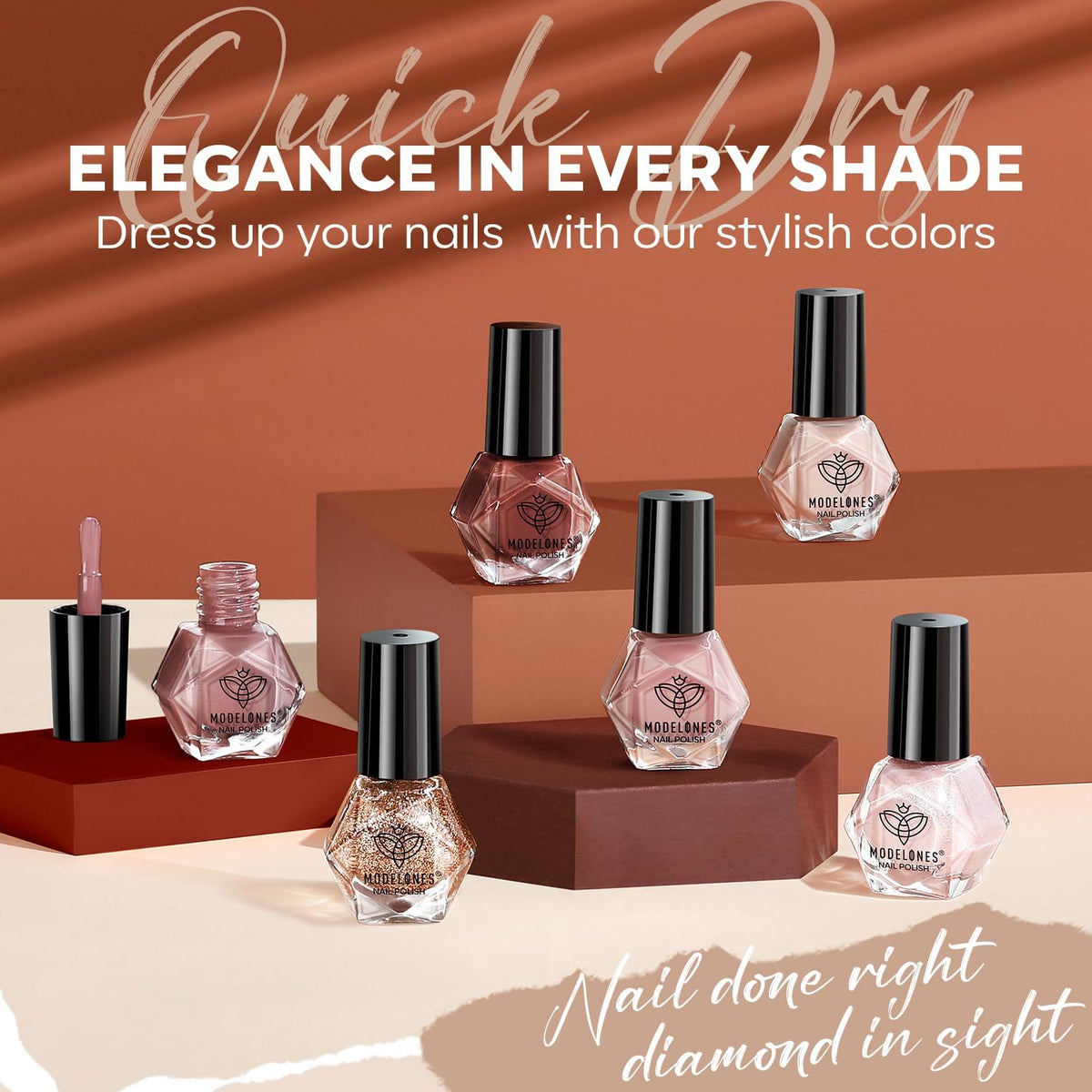 modelones Brown Nail Polish Set offers a stunning collection of 6 colors perfect for fall and winter nail art. This quick-dry mini nail lacquer kit includes shades of Nude, Burgundy, and Glitter, ideal for DIY nail art at home or in the salon. Create beautiful manicures with this Dark Red Nail Art set, a perfect gift for women and girls.