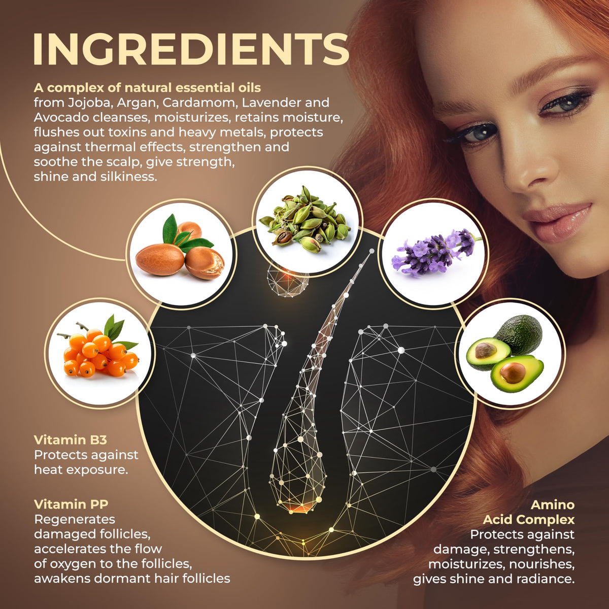 Active Ingredients :: Distilled Water, Coco GlucosidCocomidopropyl Betain, Sodium Chloride, Xanthan Gum, Citric Acid, Ginger, Coconat, Biotin, Vitamin PP, Pantenol, Amino Acids Complex, Ceramides, Quinine, Calamus Essential Oil,Lavender Essential Oil,Cardamon Essential Oil, Argan Oil, Avocado Oil, Silk Proteins, Wheat Protein, Jojoba Oil, Germaben. Cetearyl Alcohol, Limonene, Benzyl Alcohol, Nettle, Wa