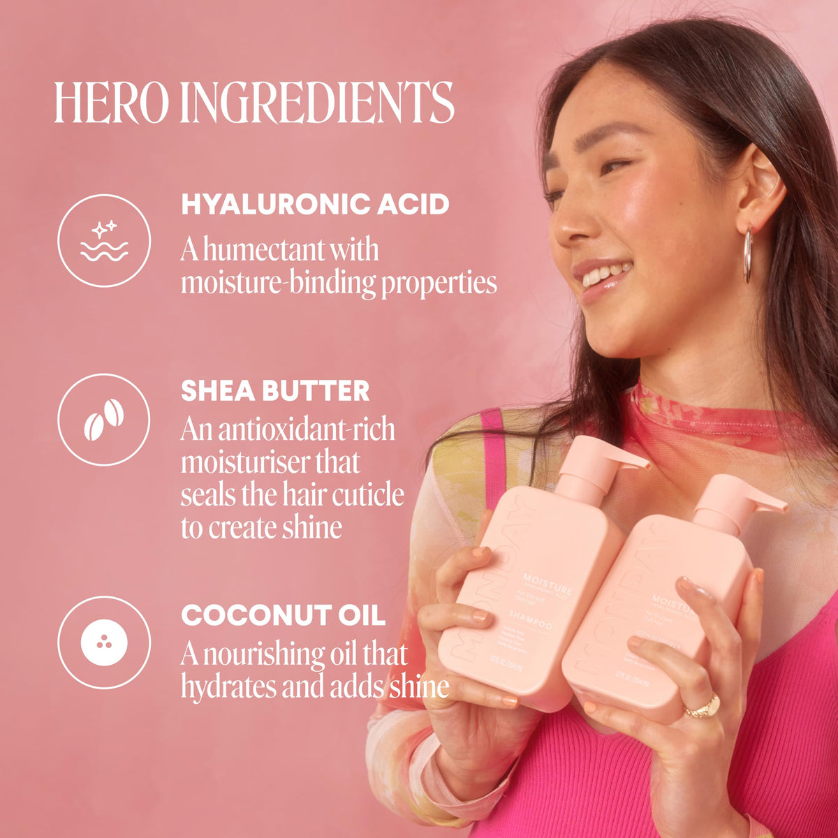 Short Product Description :: MONDAY Haircare MOISTURE Shampoo and Conditioner set for women is good for dry, damaged and stressed hair and coily and curly hair types. It’s also safe for color-treated hair. This moisturizing Shampoo and Conditioner helps to hydrate and nourish hair with Coconut Oil, Rice Protein, Shea Butter and Vitamin E—ingredients that help support hair health and maintain normal hair growth and thickness.