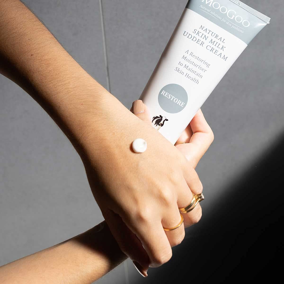 MooGoo Natural Skin Milk Udder Cream is a lightweight moisturizer suitable for sensitive, dry, or irritated skin. It provides gentle hydration and nourishment for all ages, including children, leaving the skin soft and supple.