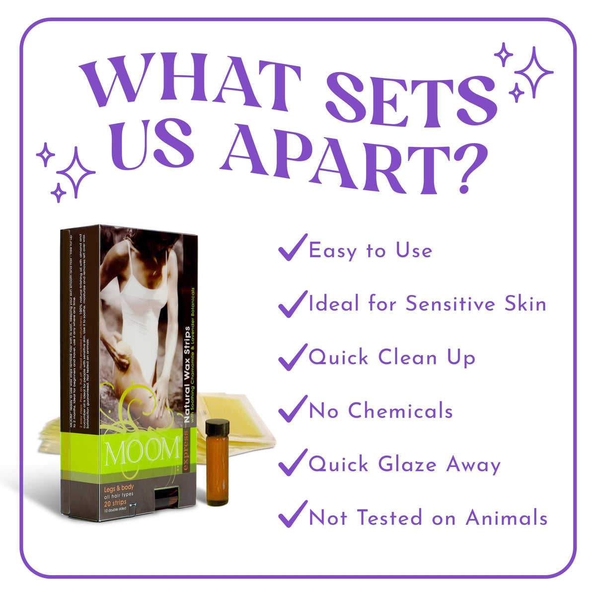 Experience smooth and hair-free skin with MOOM Express Wax Strips. These chamomile and lavender-infused strips offer a convenient hair removal solution for legs, bikini area, face, and body, leaving your skin silky and nourished.