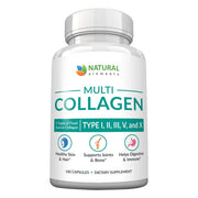 Enhance your skin's health with Multi Collagen 180 Protein Capsules. This proprietary blend of Type I, II, III, V, X Collagen from Eggshell, Chicken, Wild Fish & Grass-Fed Beef provides 2025mg per serving for comprehensive support.