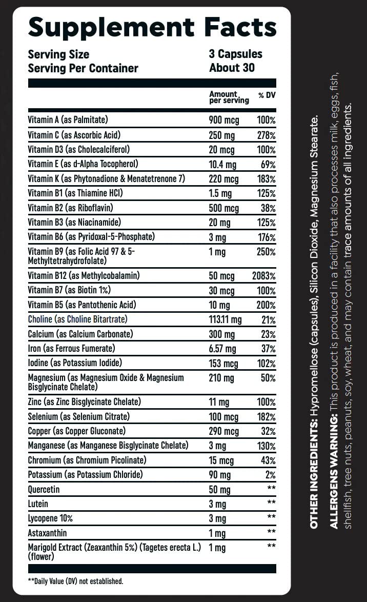 Ingredients: Vitamin A B1 B2 B3 B6 B9 C D3 K, Choline, Calcium, Iron, Lodine, Zinc, Copper, Chromium etc