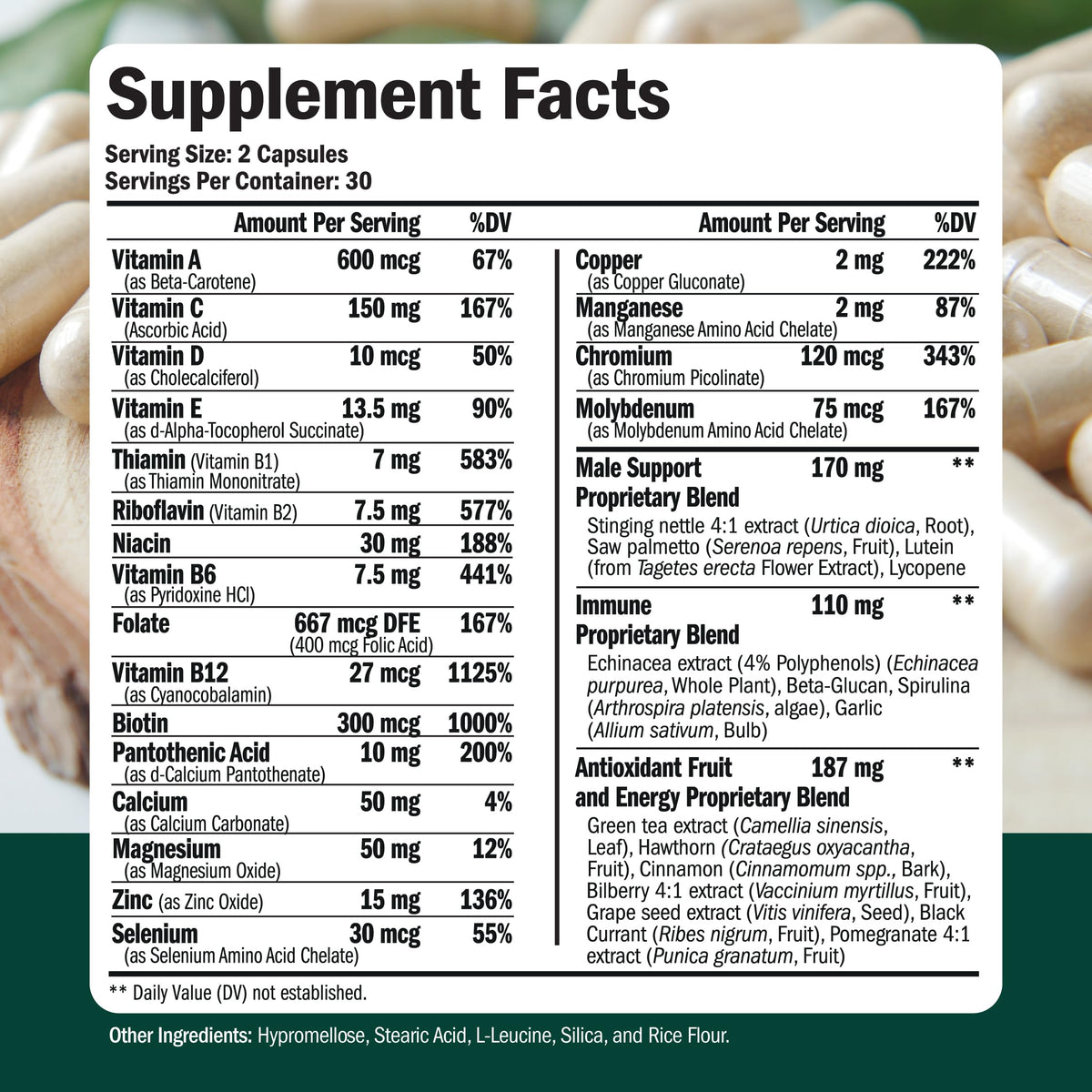 Ingredients: Vitamin A, Vitamin C, Vitamin D, Vitamin E, Vitamin B1 Thiamin, Vitamin B2 Riboflavin, Vitamin B6, Vitamin B12, Niacin, Biotin, Folic Acid, Pantothenic Acid, Calcium, Magnesium, Zinc, Selenium, Copper, Manganese, Chromium, Molybdenum. Proprietary Blends Male Support Proprietary Blend Stinging Nettle 41 Extract, Saw Palmetto, Lutein, Lycopene. Immune Proprietary Blend Echinacea Extract 4 Polyphenols, BetaGlucan, Spirulina, Garlic. Antioxidant Fruit and Energy Proprietary Blend Green Tea Extract, Hawthorn Extract, Cinnamon, Bilberry 41 Extract, Grape Seed Extract, Black Currant Extract, Pomegranate 41 Extract. Other Ingredients Hypromellose Capsule, Rice Flour, LLeucine, Silica, Stearic Acid.