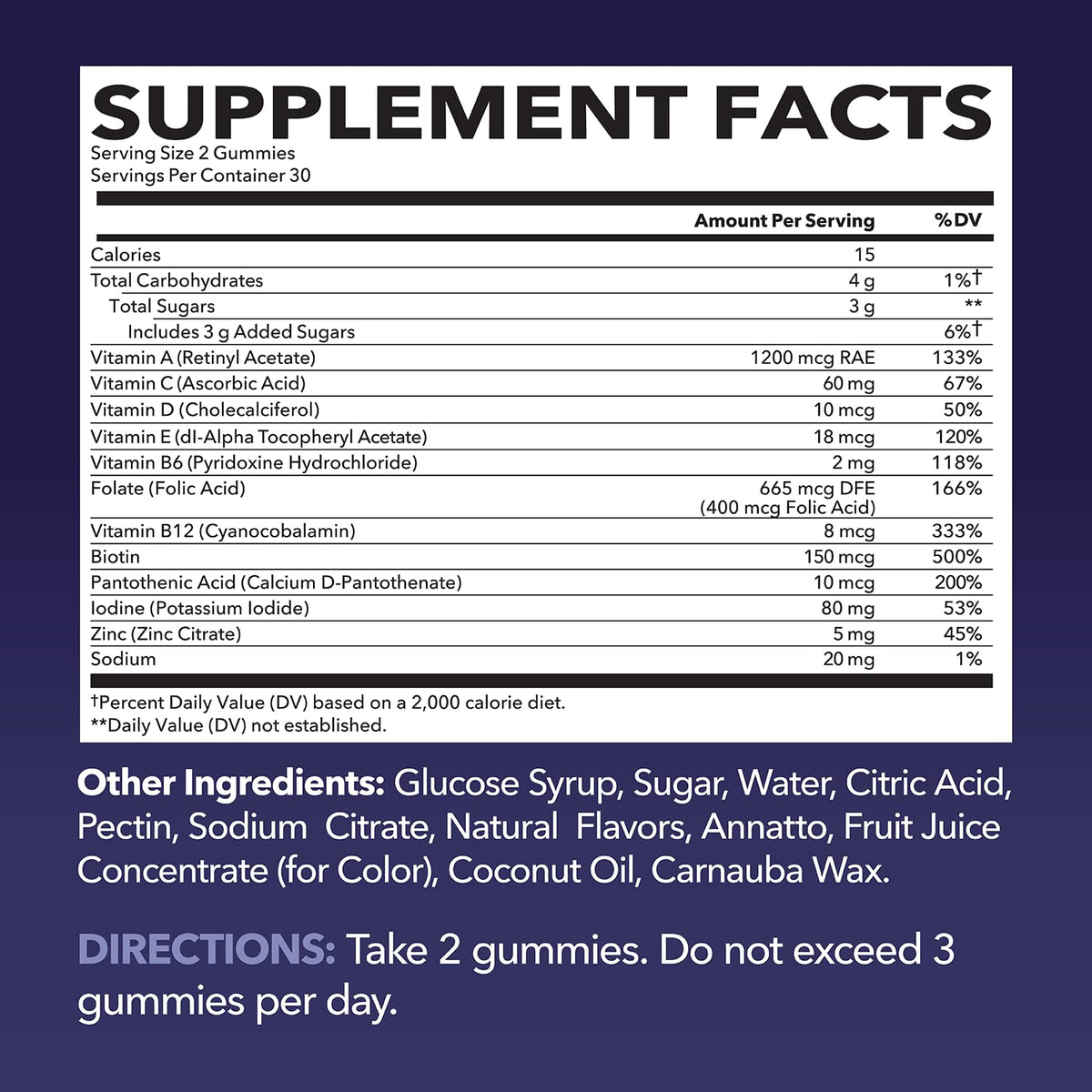 Ingredients: Vitamin A, Vitamin C, Vitamin D, Vitamin E, Vitamin B6, Folic Acid, Vitamin B12, Biotin, Pantothenic Acid, Iodine, Zinc, Sodium, Natural Flavors, Natural Colors annatto, elderberry juice, grape juice concentrate