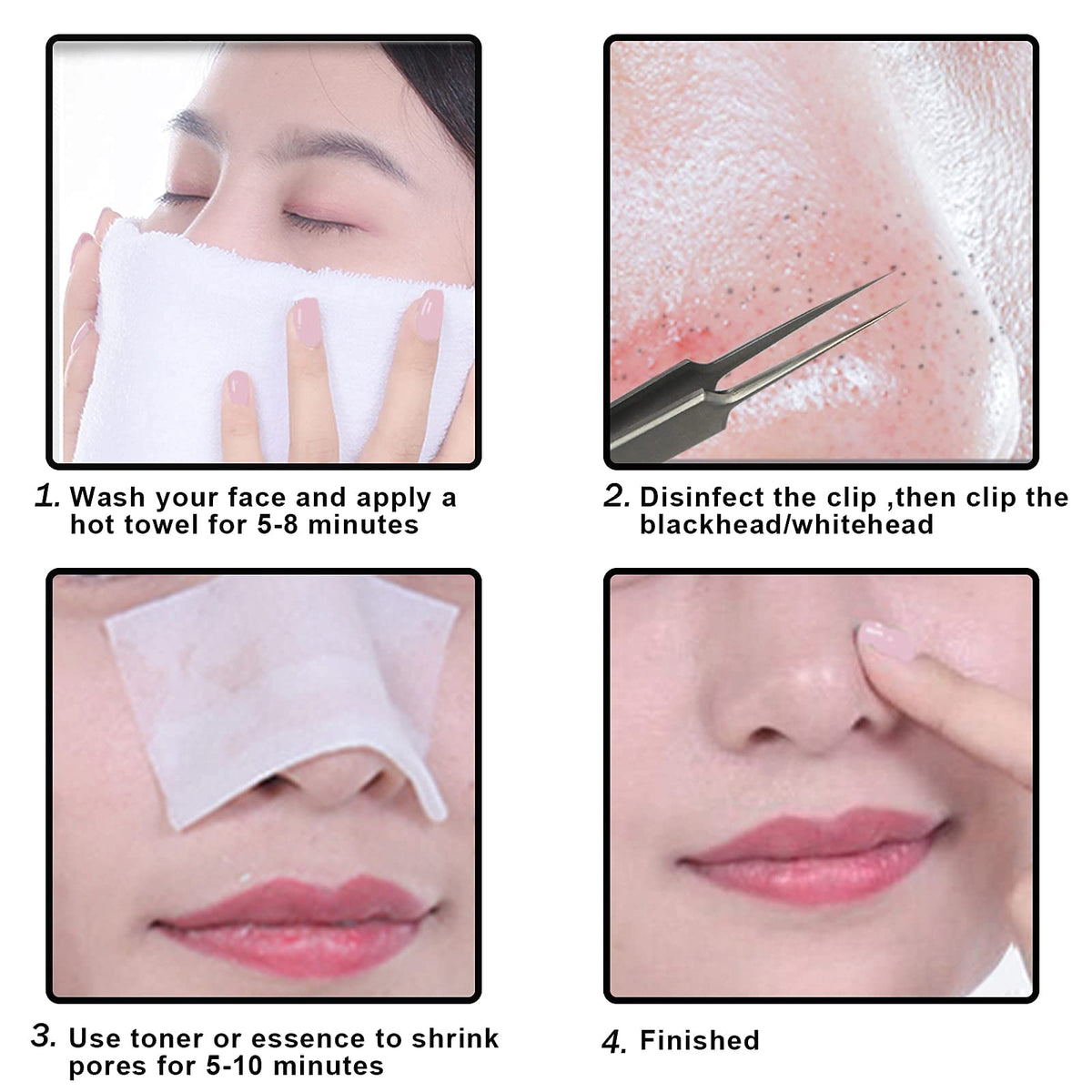 1. Wash your face and apply a hot towel for 58 minutes. 2. Disinfect the clip. 3. Clip the blackheadwhitehead. 4. Clean the nose. 5. Use toner or essence to shrink pores for 510 minutes.