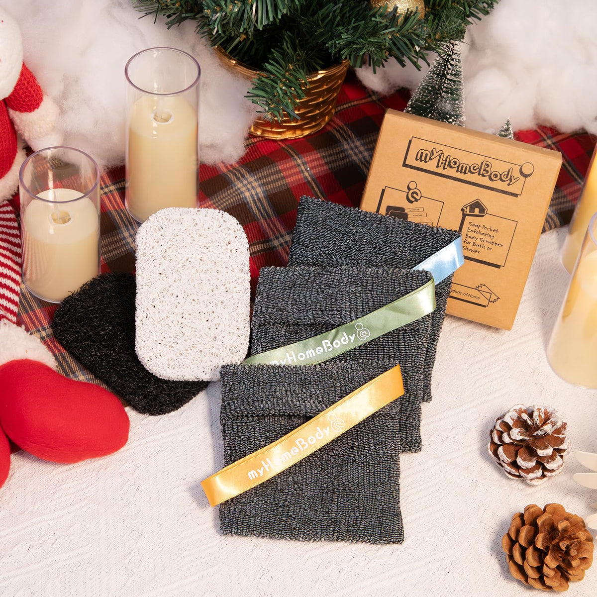 myHomeBody Soap Pocket Squares Exfoliating Pouch, Body Scrubber, Exfoliator Sponge for Bath or Shower, or Leftover Bits Saver, Graphite Gray, 3 Pack + 2 Lift Pads