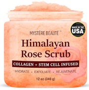 Revitalize your skin with MYSTÉRE BEAUTÉ Himalayan Salt Body Scrub. This 12 oz scrub infused with collagen and stem cells offers deep cleansing for acne, scars, and wrinkles while moisturizing and rejuvenating your skin for a radiant glow.