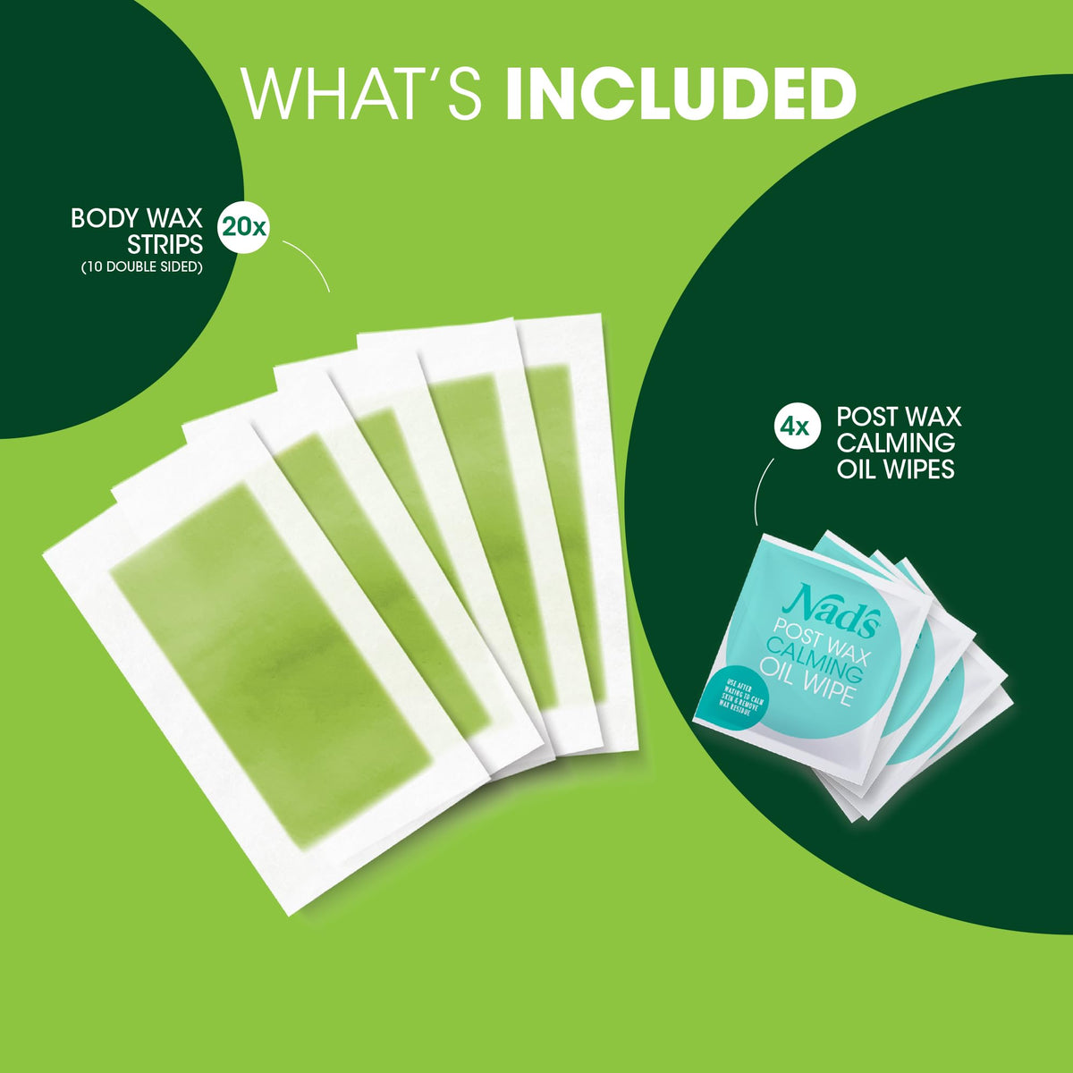 Ensure skin is clean, dry and free of oils and moisturisers. Briskly rub strips between palms to warm wax. Slowly separate a double Nads Hair Removal Strip into two strips. Using the palm of your hands or fingertips, apply strip with firm pressure and firmly smooth over 34 times in direction of hair growth. Holding skin taut with one hand, quickly pull strip off in the opposite direction of hair growth. Remember to hold skin taut with the other hand and to pull close and parallel to the skin rather than upward into the air. For the perfect finish remove any residue with Nads Post Calming Oil Wipes.