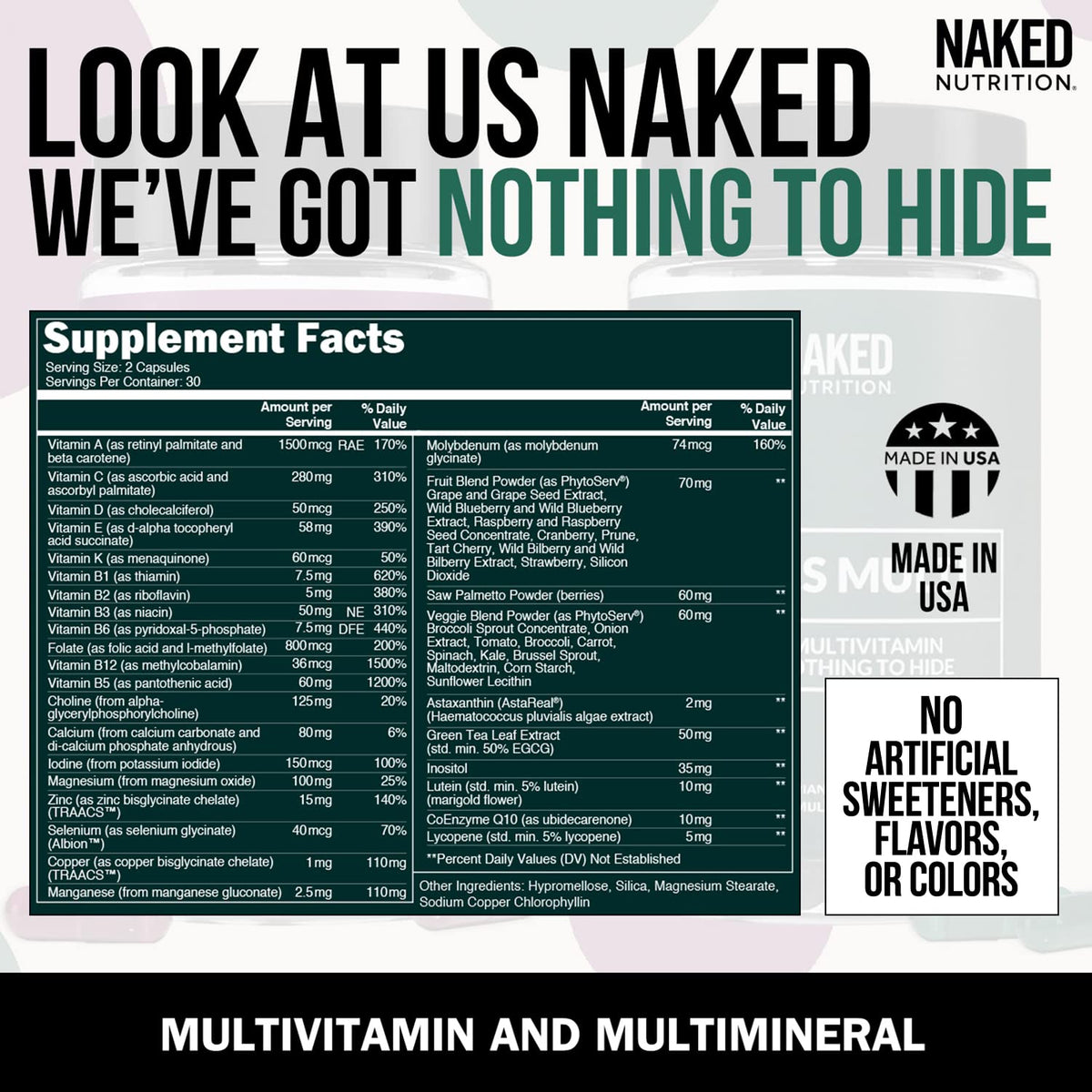 NAKED Men’s Multi is a daily multivitamin tailored for men's health. Packed with essential vitamins like A, C, E, Selenium, Zinc, and fruit extracts, this gluten-free and vegetarian formula boosts immune support. Each bottle contains 60 capsules.