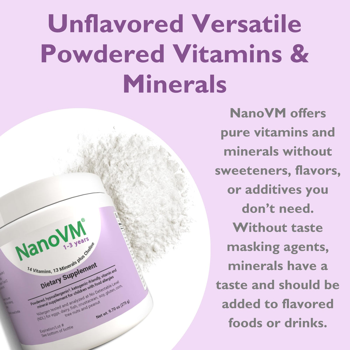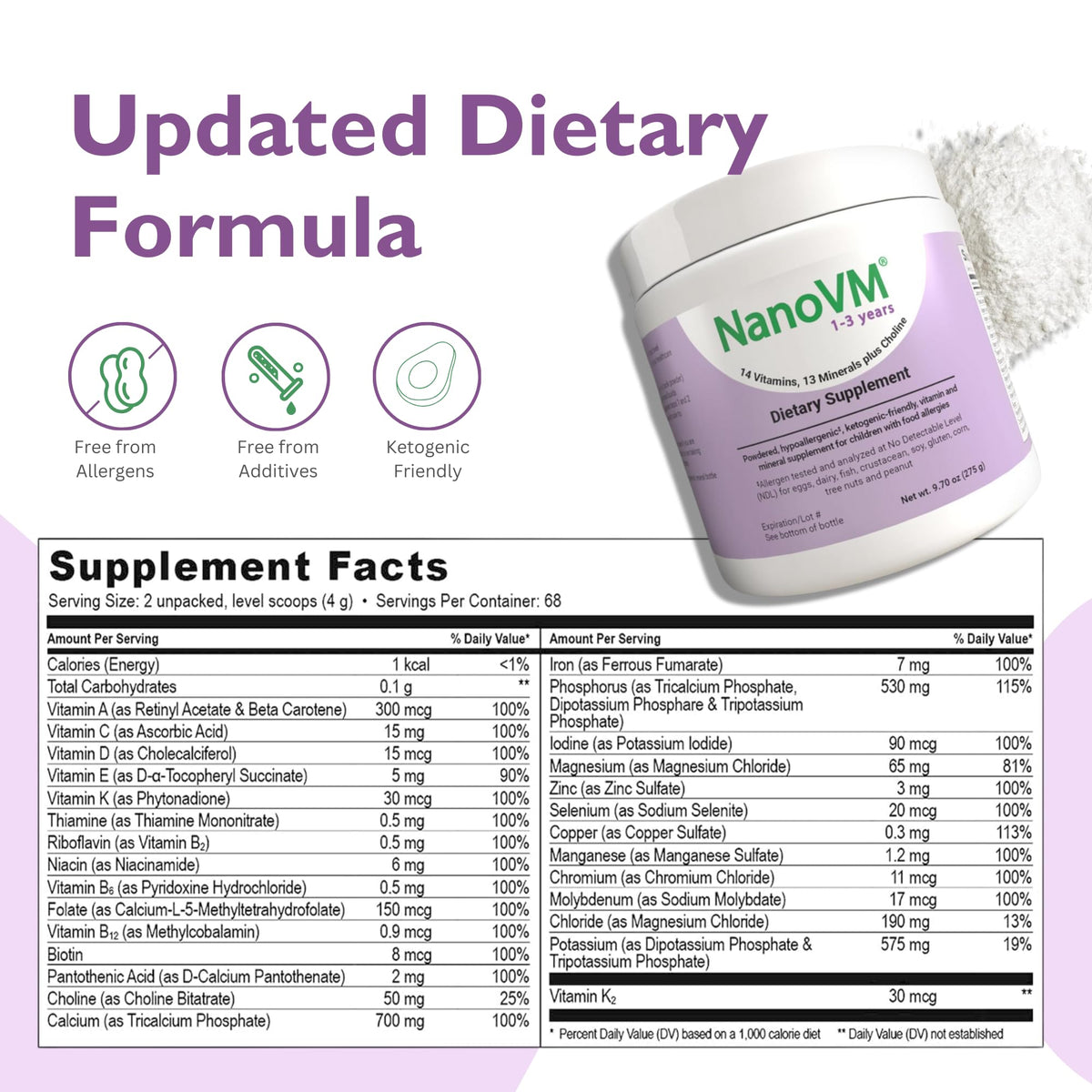 NanoVM 1-3 Years is a specially formulated allergen-free multivitamin powder for toddlers, providing essential vitamins and minerals to support their growth and development.