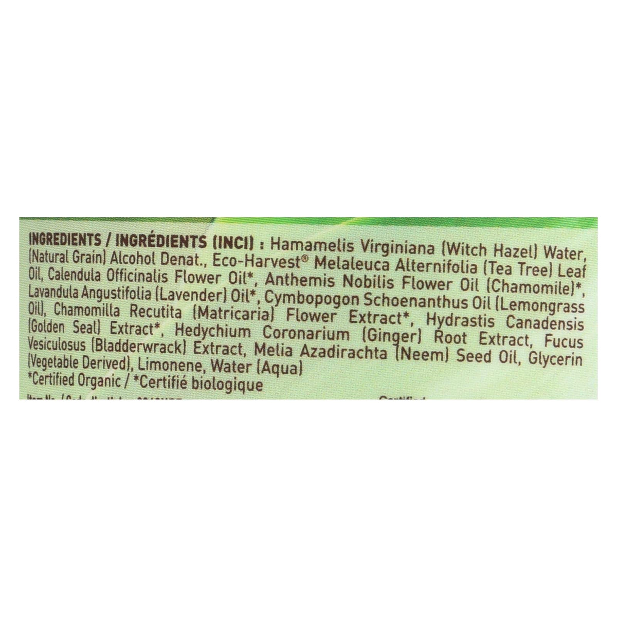 Ingredients: Hamamelis Virginiana Witch Hazel Water, Natural Grain Alcohol Denat, EcoHarvest Melaleuca Alternifolia Tea Tree Leaf Oil, Calendula Officinalis Flower Oil, Anthemis Nobilis Flower Oil Chamomile, Lavandula Angustifolia Lavender Oil, Cymbopogon Schoenanthus Oil Lemongrass Oil, Chamomilla Recutita Matricaria Flower Extract, Hydrastis Canadensis Golden Seal Extract, Hedychium Coronarium Ginger Root Extract, Fucus Vesiculosus Bladderwrack Extract, Melia Azadirachta Neem Seed