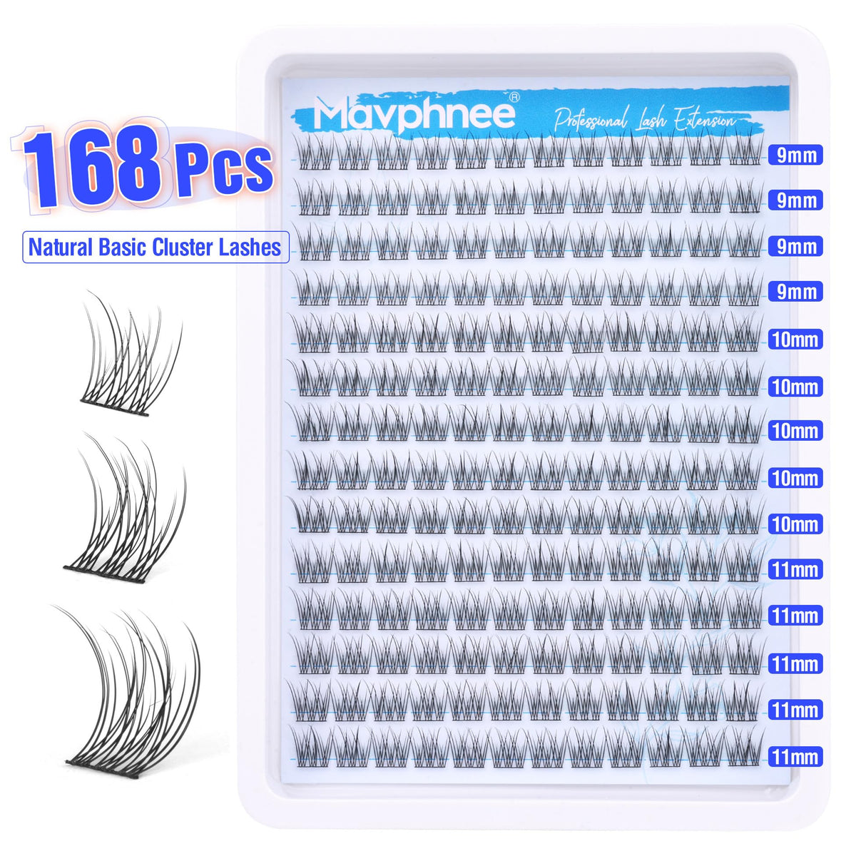 Natural Cluster Lashes Kit 168 Pcs Wispy Lash Extensions CC-Curly 9-11MM Mixed Lengths Eyelash Extension Individual Kit with Lashes Bond and Seal and Tweezers DIY at Home by Mavphnee