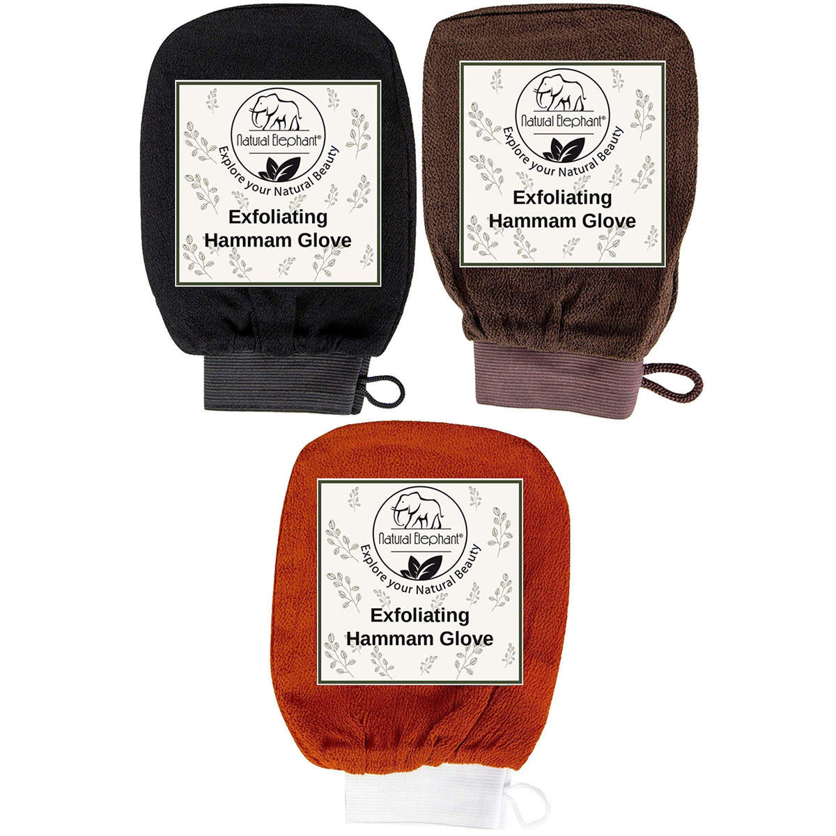 Natural Elephant Exfoliating Hammam Glove - Face and Body Exfoliator Mitt (Black, Brown and Orange (Pack of 3))