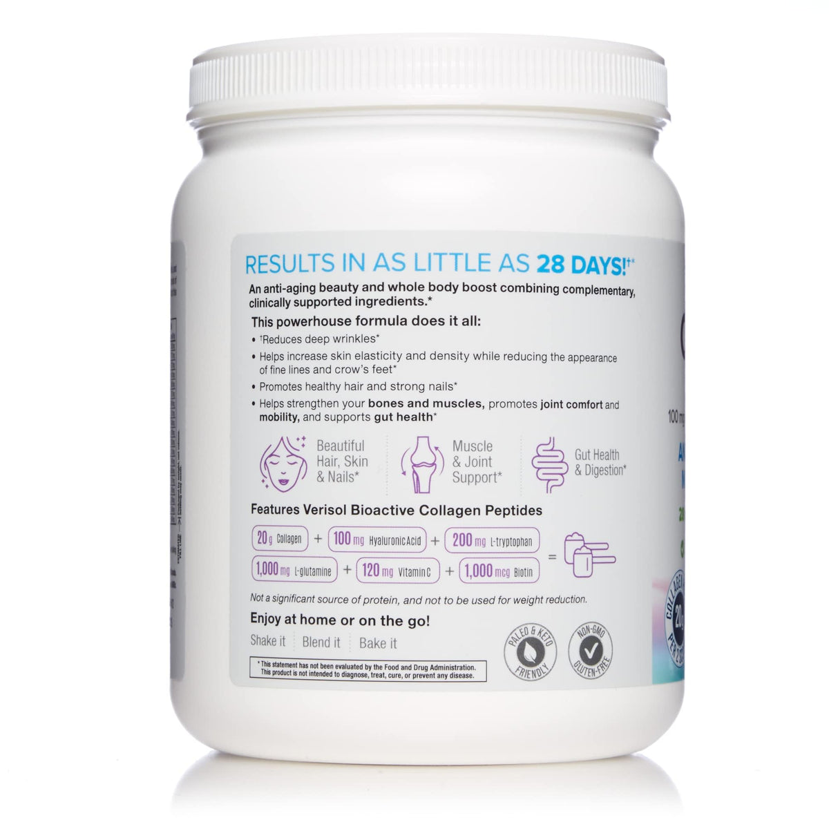 Ingredients :: Vitamin C (as calcium ascorbate), Biotin, Hydrolyzed Collagen (from bovine) Type I and II, L-Glutamine, L-Tryptophan, Hyaluronic Acid