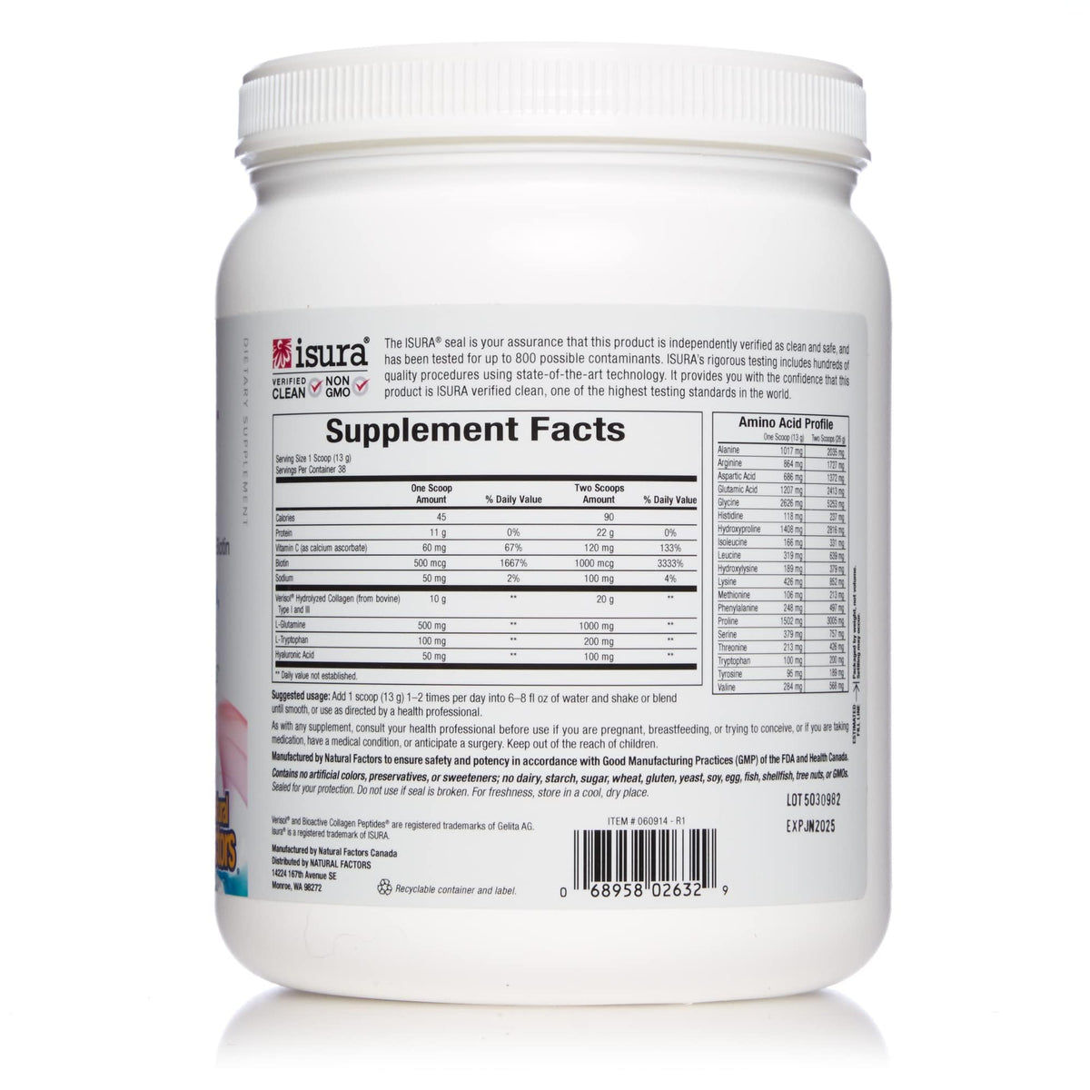 Ingredients: Vitamin C as calcium ascorbate, Biotin, Hydrolyzed Collagen from bovine Type I and II, LGlutamine, LTryptophan, Hyaluronic Acid