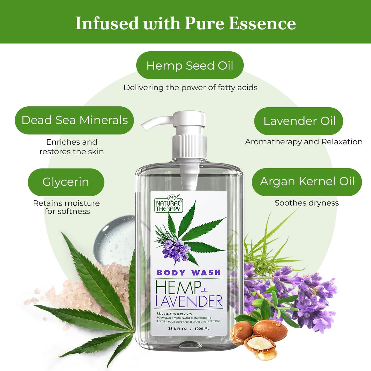 Natural Therapy Body Wash for Women and Men with Hemp & Lavender Oils is a luxurious shower gel that cleanses and moisturizes the skin. Enriched with Dead Sea Minerals, this pack of 2 body washes nourishes and revitalizes your skin, leaving it feeling refreshed and rejuvenated.