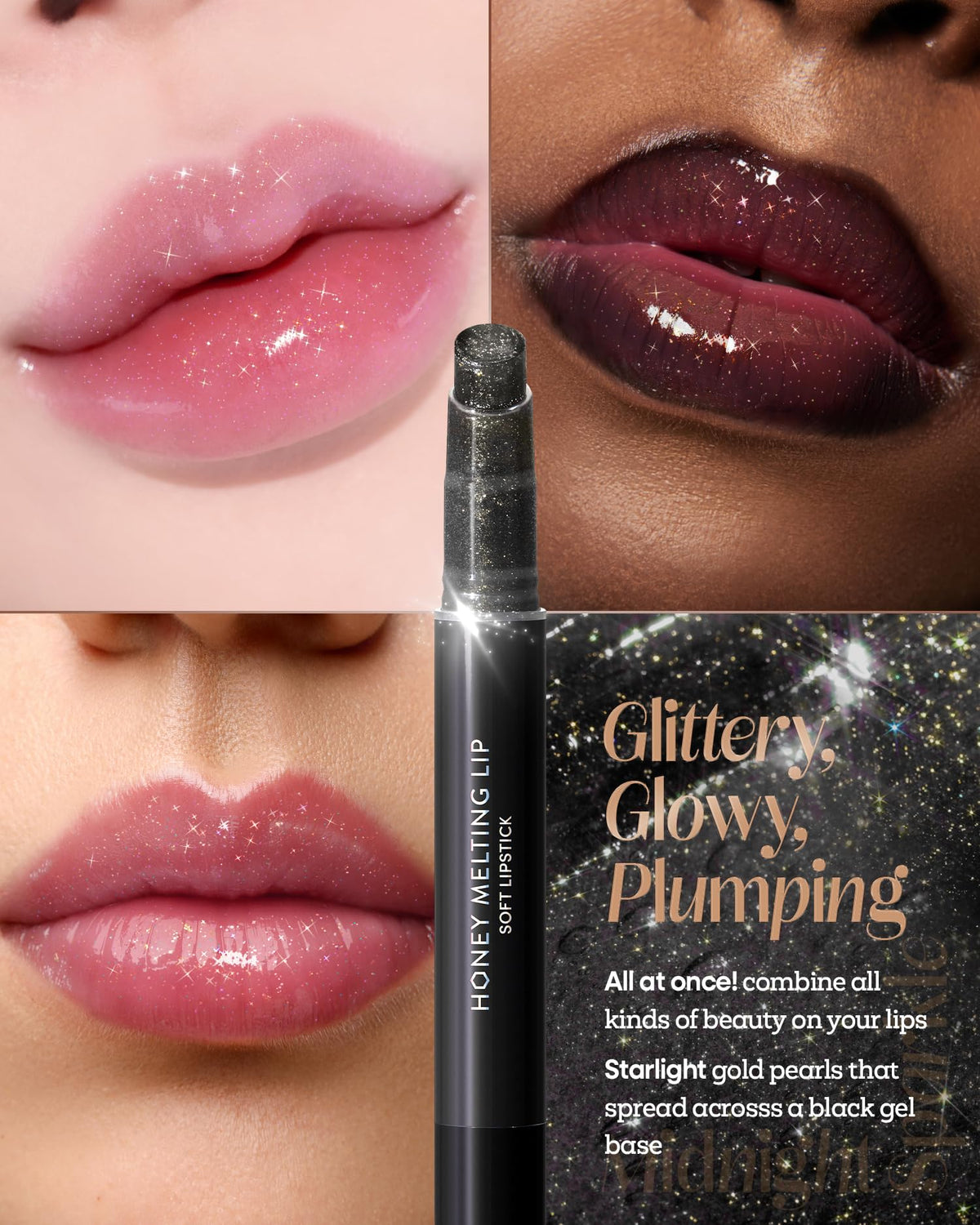 Get luscious lips with Nature Republic HONEY MELTING LIP GLITTER & PLUMPING in Midnight Sparkle. This soft lip stick offers moisturizing gloss, volumizing formula, color-changing sheer tint, and a shine glimmer finish for a glamorous and nourishing lip makeup experience.