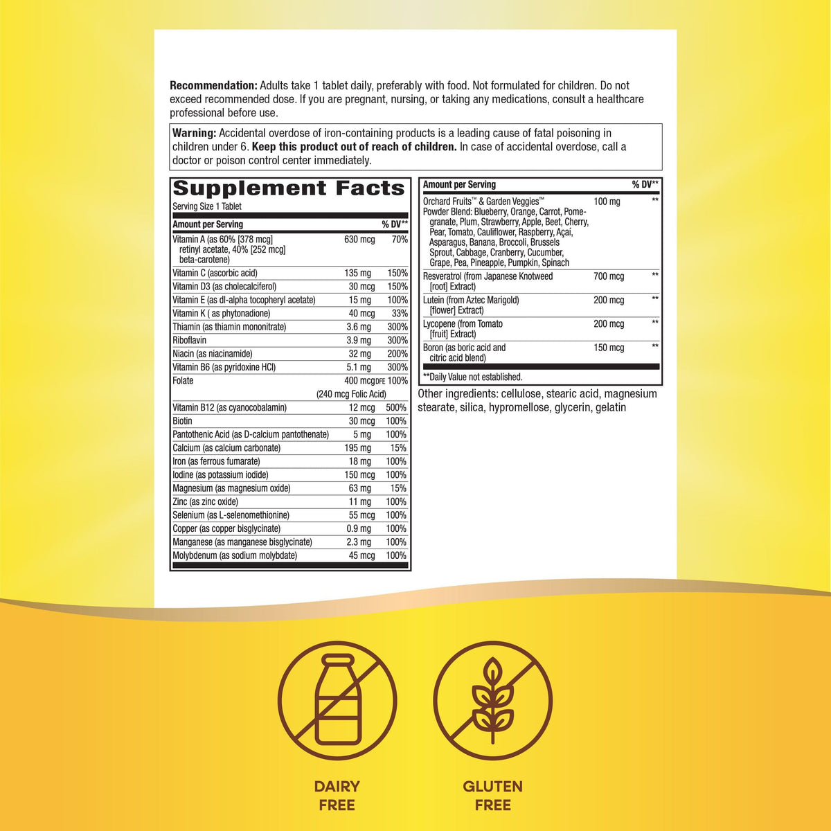 Ingredients :: Vitamin A (as 60% 378 mcg retinyl acetate, 40% 252 mcg beta carotene); Vitamin C (ascorbic acid); Vitamin D3 (as cholecalciferol); Vitamin E (as dl-alpha tocopheryl acetate); Vitamin K (as phytonadione); Thiamin (as thiamin mononitrate); Riboflavin; Niacin (as niacinamide); Vitamin B6 (as pyridoxine HCl); Folate (240 mcg Folic Acid); Vitamin B12 (as cyanocobalamin); Biotin; Pantothenic Acid (as D-calcium pantothenate); Calcium (as calcium carbonate); Iron (as ferrous fumarate); Magnesium (as magnesium oxide); Zinc (as zinc oxide); Copper (as copper sulfate); Manganese (as manganese sulfate); Orchard Fruits™ & Garden Veggies™ Powder Blend: Blueberry, Orange, Carrot, Pomegranate, Plum, Strawberry, Apple, Beet, Cherry, Pear, Tomato, Cauliflower, Raspberry, Açaí, Asparagus, Banana, Broccoli, Brussels Sprout, Cabbage, Cranberry, Cucumber, Grape, Pea, Pineapple, Pumpkin, Spinach; Resveratrol (from Japanese Knotweed root Extract); Lutein (from Aztec marigold extract) (flower); Lycopene (from tomato extract); Boron (as boric acid and citric acid blend); Cellulose; Magnesium Stearate; Silica; Hypromellose; Polydextrose; Titanium Dioxide Color; Riboflavin Color; Gelatin; Maltodextrin; Medium Chain Triglycerides