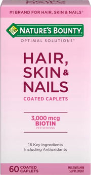 Nature's Bounty Optimal Solutions Hair, Skin & Nails Formula is a premium supplement designed to enhance your beauty from within. With 3,000 mcg of Biotin in each coated caplet, this formula supports healthy hair, glowing skin, and strong nails.