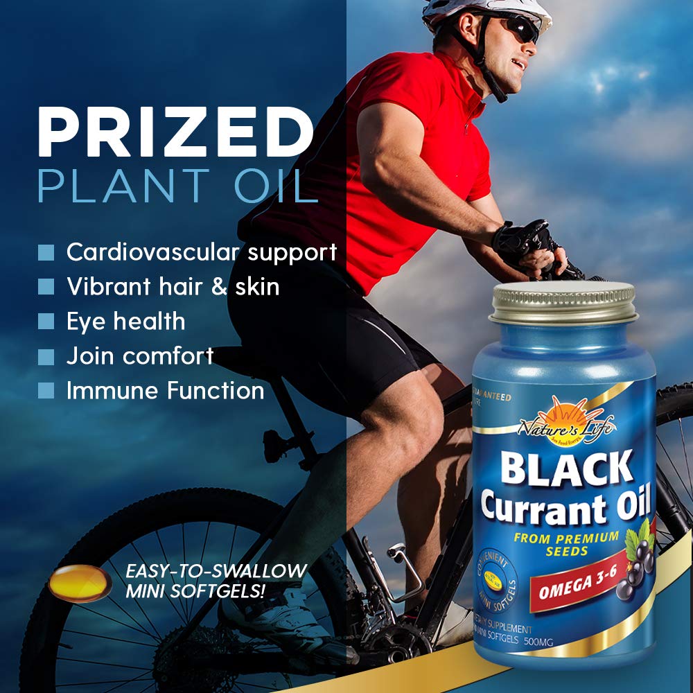 Nourish your body with Nature's Life Black Currant Oil Minis 500 mg, enriched with Omega 3-6 for skin, hair, heart, and joint health. Each 90ct bottle offers a convenient way to boost your essential fatty acid intake.