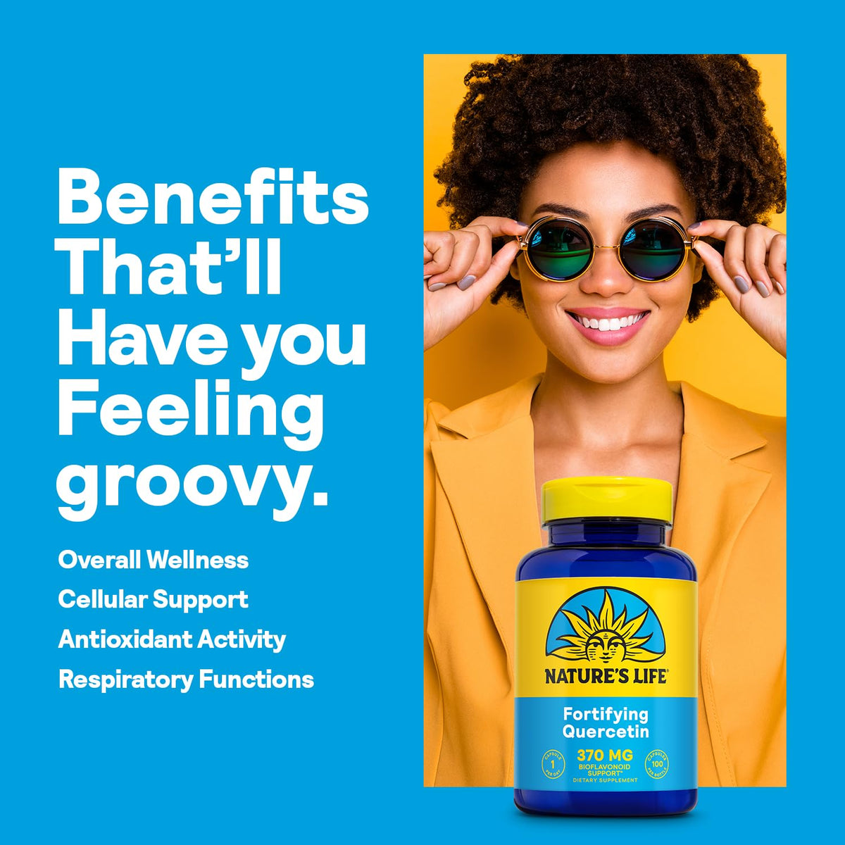 Support your overall wellness with Nature's Life Fortifying Quercetin capsules. This bioflavonoid supplement offers 100 vegetarian capsules with 370 mg of Quercetin for antioxidant support and a 60-day money-back guarantee.
